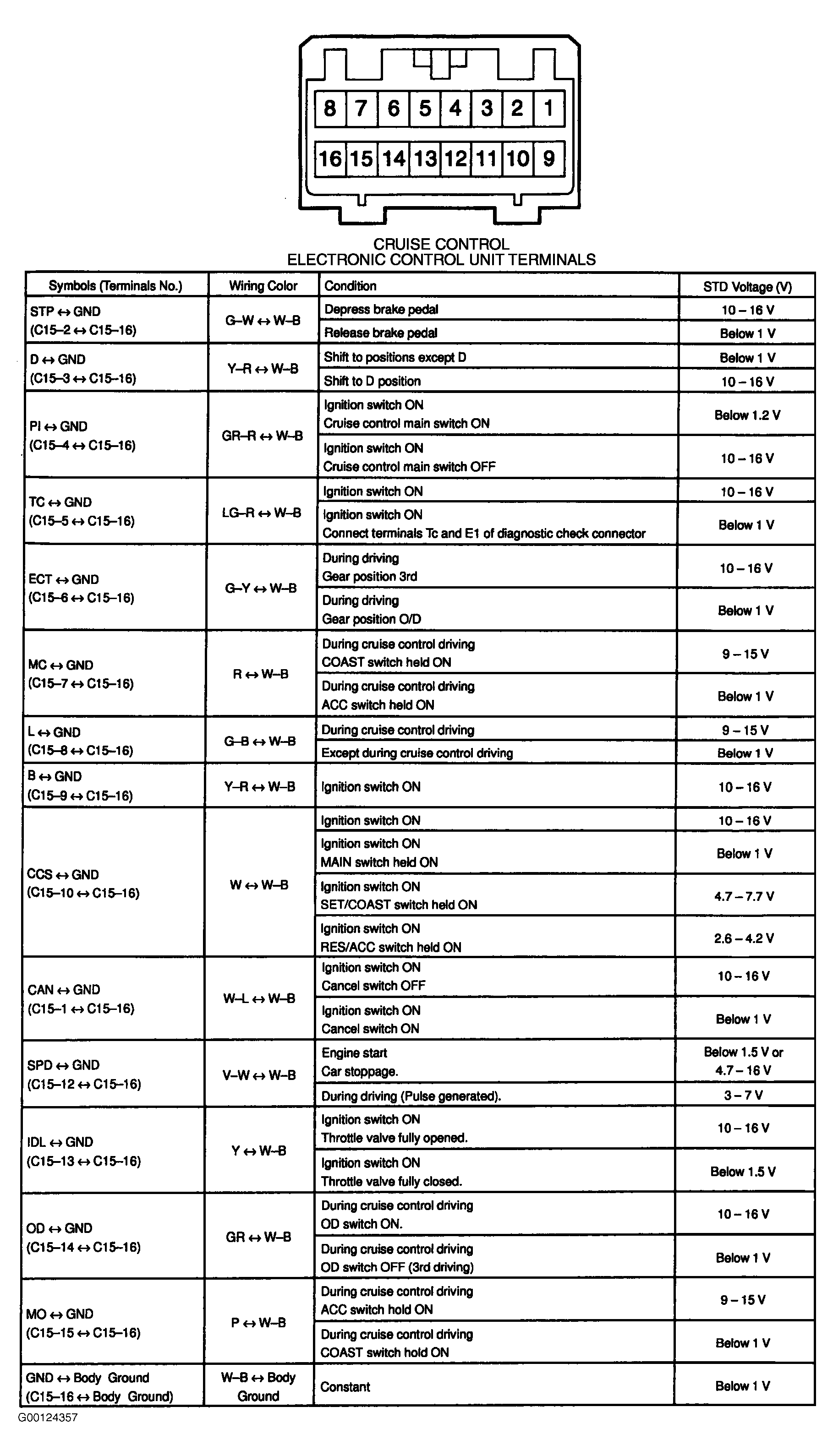 - Turn ignition off. Remove cruise control ECU with connector attached. See Figure. Turn ignition on. Using a DVOM, measure voltage by backprobing between cruise control ECU 16-pin electrical harness connector terminal No. 3 (Yellow/Red wire) and good body ground point. See Figure. With gear shift lever in Drive, battery voltage should exist. With gear shift lever in any position other than Drive, voltage should be less than one volt. If voltage is not as specified, go to next step. If voltage is as specified, no problem is indicated at this time. Fault may be intermittent, go to step 11.