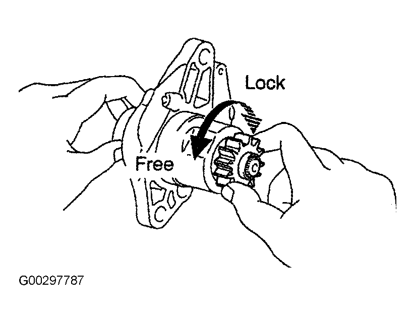 - Inspect clutch pinion gear by rotating pinion gear counterclockwise. Ensure gear turns freely in counterclockwise direction, but locks up when turned clockwise. See Fig 1. If not as specified, replace clutch assembly.