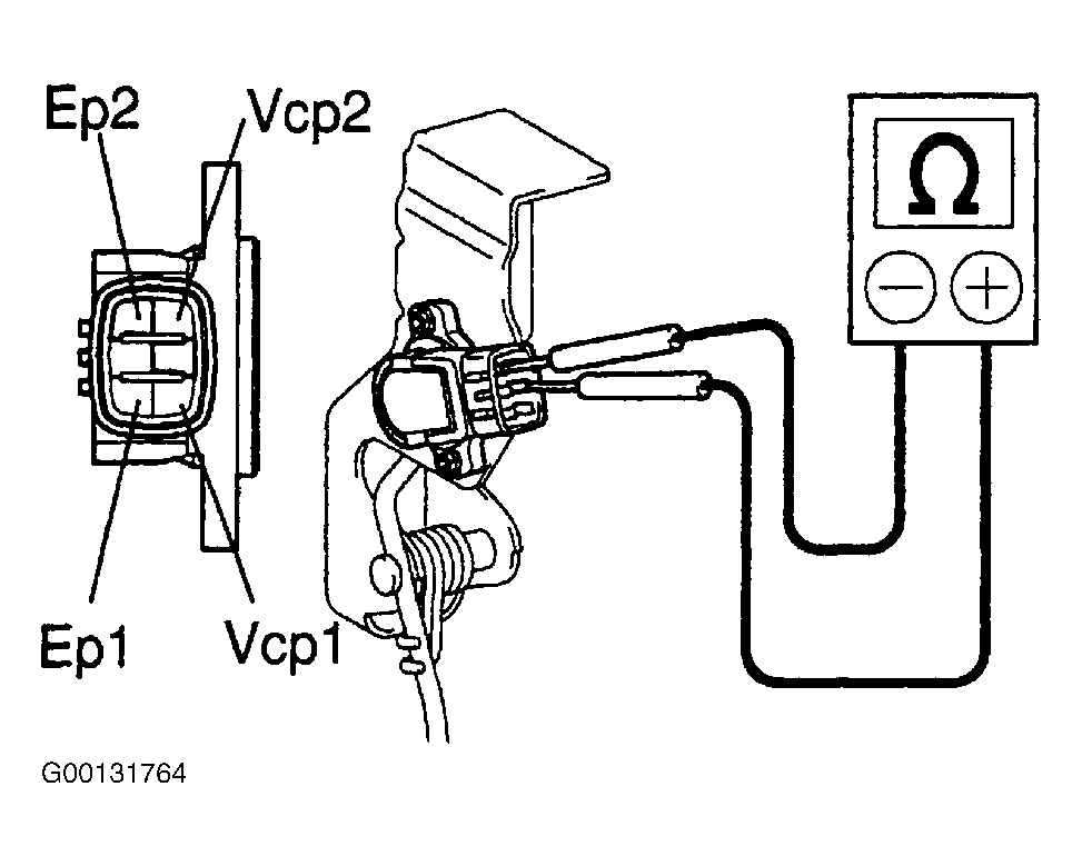 - Check accelerator pedal position sensor operation. Resistance between terminals Vcp1 and Ep1, and between terminals Vcp2 and Ep2 should be 1.5-6.0 k/ohms. See Fig 1. See ENGINE SENSORS & SWITCHES in SYSTEM & COMPONENT TESTING - GS300, IS300, GS430, LS430 & SC430 article. Replace accelerator pedal position sensor as necessary. If accelerator pedal position sensor is okay, check for short or open circuit in wiring harness between ECM E5 connector and accelerator pedal position sensor. See WIRING DIAGRAMS article. Repair wiring as necessary.