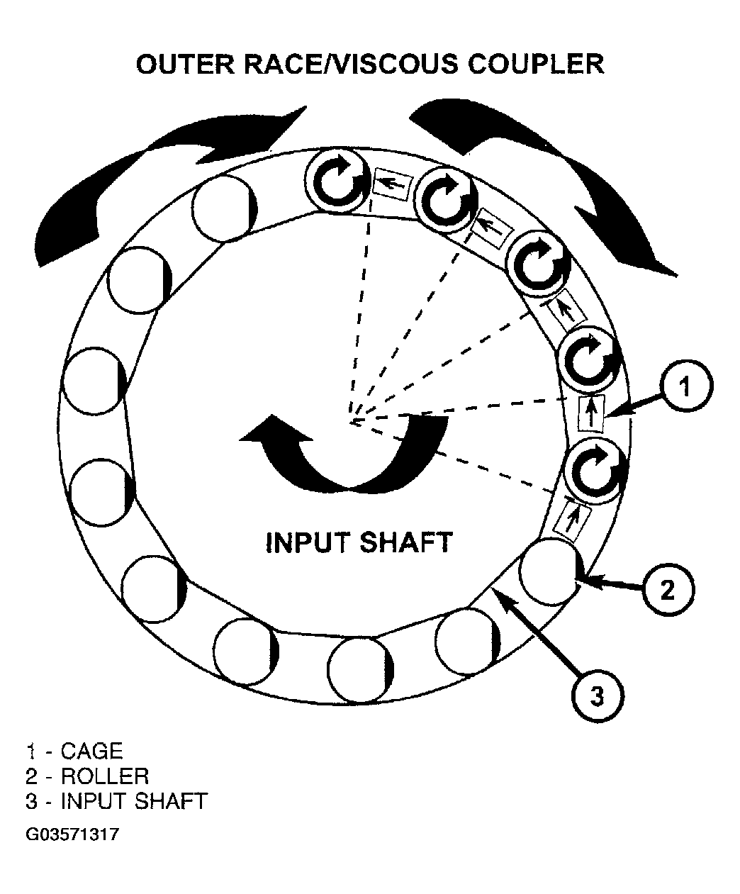 During normal driving conditions, (no wheel slip), the inner shaft (front axle) and outer race (viscous coupler) are running at different speeds due to the different gear ratios between the front and rear differentials. In this condition, the outer race is always spinning faster (overdriving between 5-32 rpm) than the inner shaft. When the BOC (Figure ) is running under these conditions, at low vehicle speeds the drag shoes and the cage keep the rollers up on the left side (forward side) of the inner shaft flats. This is what is known as "overrunning mode." Notice that when the clutch is in overrunning mode, the rollers are spinning clockwise and with the outer race, thus no torque is being transferred.