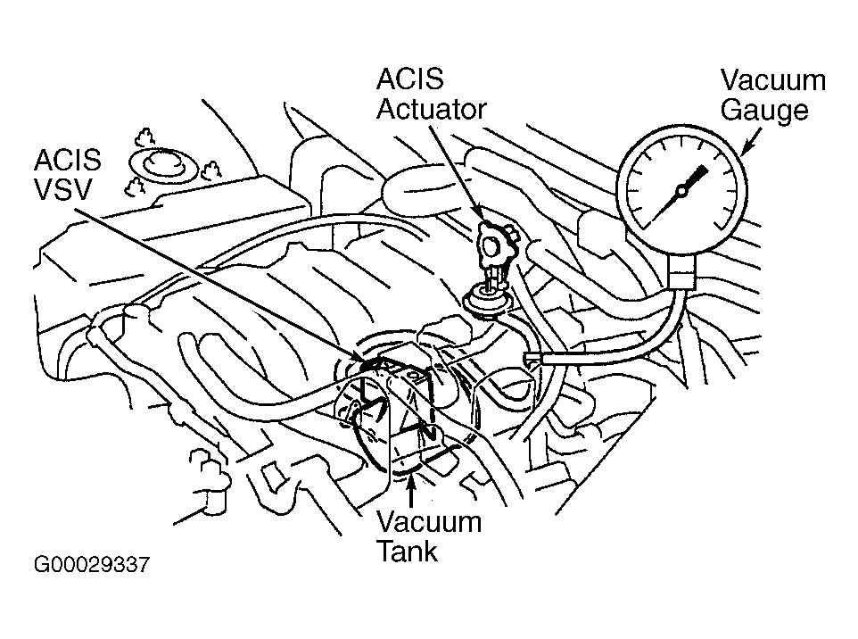 1. Remove throttle body. See THROTTLE BODY under FUEL SYSTEM in REMOVAL & INSTALLATION - EXCEPT GX470 article. Remove upper and lower intake manifolds. See KNOCK SENSOR under SENSORS & SWITCHES in REMOVAL & INSTALLATION - EXCEPT GX470 article. Install a 3-way vacuum "T" fitting in vacuum hose between Intake Air Control Valve (IACV) actuator and ACIS Vacuum Switching Valve (VSV). See Fig 1. Reinstall intake manifolds and throttle body.