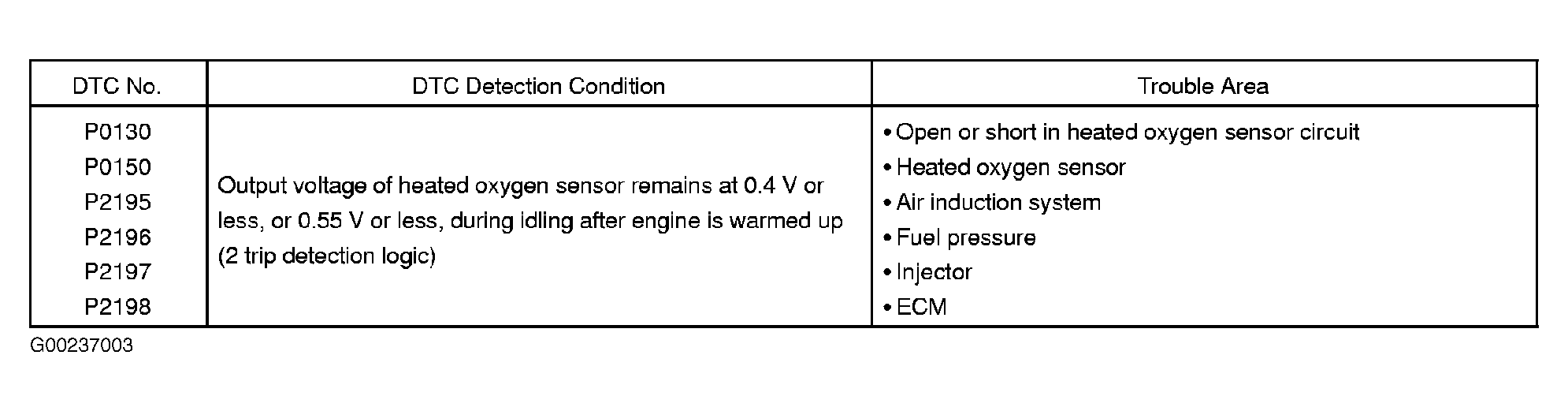 Home >> Toyota >> 2004 >> Matrix Base, FWD, Automatic >> Repair and Diagnosis >> External Pages >> Different car >> Section 129 (Engine Control System Self Diagnostics) >> Diagnostic Tests >> DTC P0130, DTC P0150, DTC P2195, DTC P2196, DTC P2197 Or DTC P2198 >> Possible Causes
