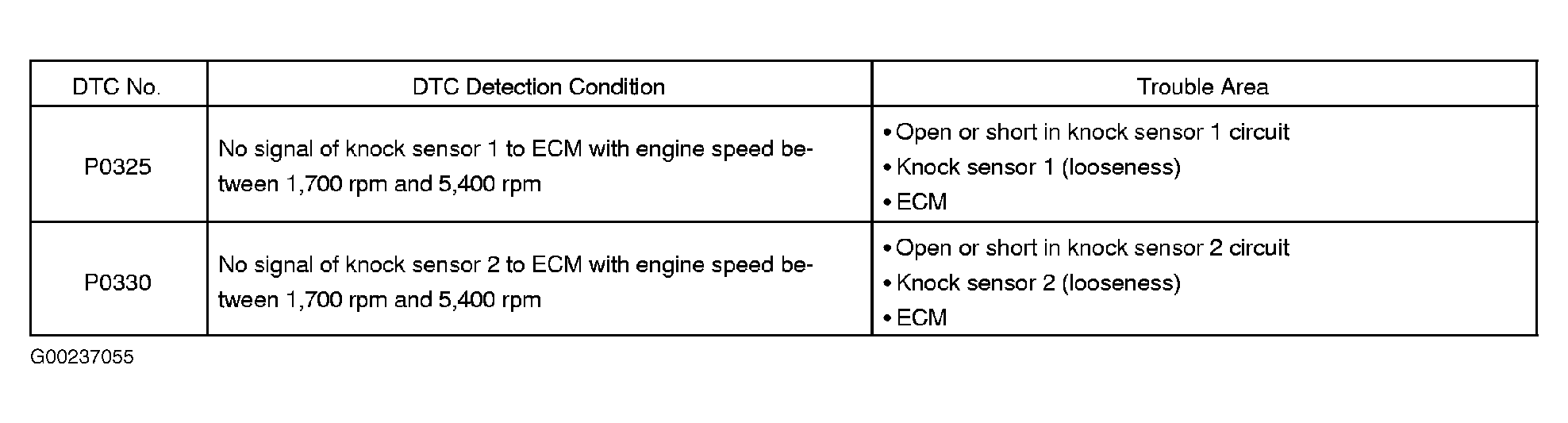 Home >> Toyota >> 2004 >> Matrix Base, FWD, Automatic >> Repair and Diagnosis >> External Pages >> Different car >> Section 129 (Engine Control System Self Diagnostics) >> Diagnostic Tests >> DTC P0325: Knock Sensor No. 1 Circuit Or DTC P0330: Knock Sensor No. 2 Circuit >> Possible Causes