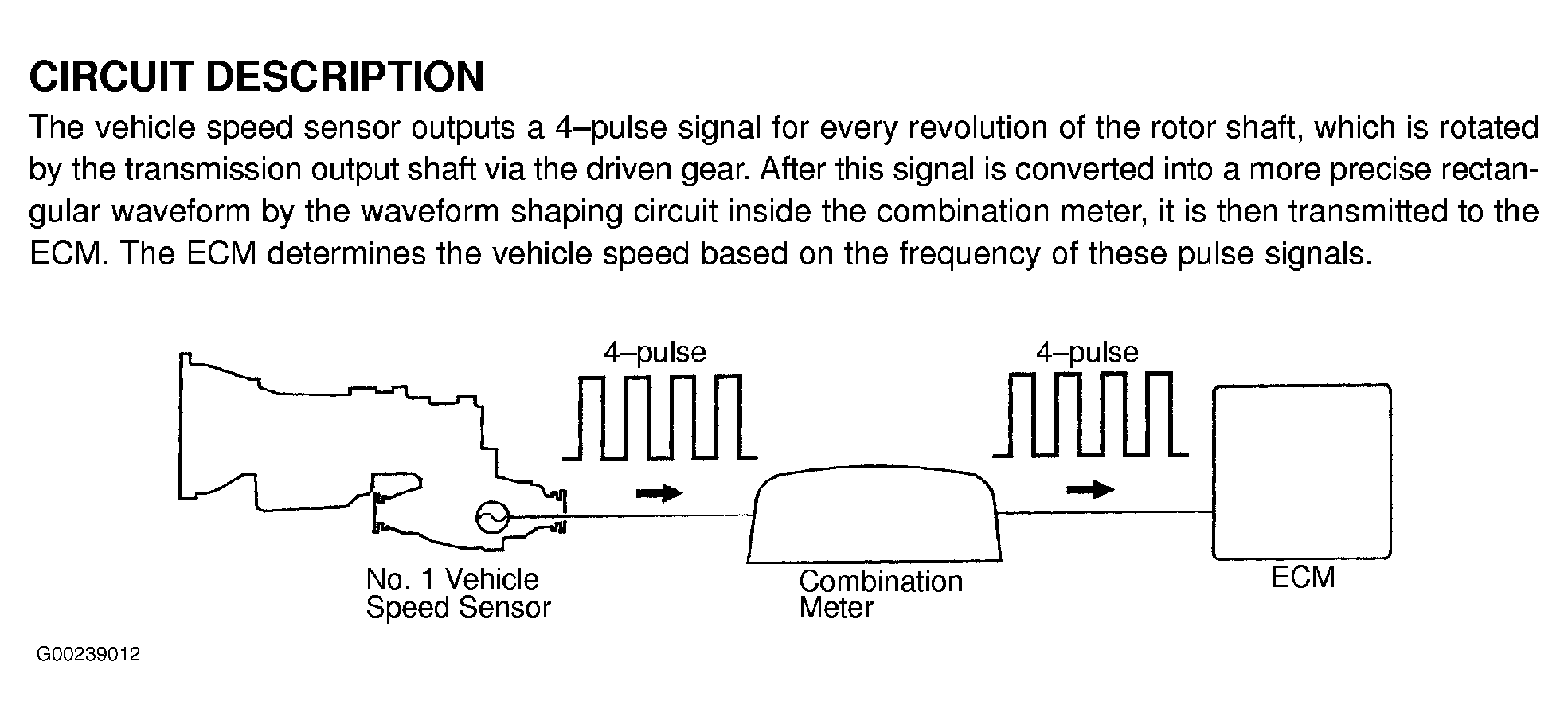Home >> Toyota >> 2004 >> Matrix Base, FWD, Automatic >> Repair and Diagnosis >> External Pages >> Different car >> Section 129 (Engine Control System Self Diagnostics) >> Diagnostic Tests >> DTC P0500: Vehicle Speed Sensor "A" Circuit Or DTC P0503: Vehicle Speed Sensor "A" Intermittent/Erratic/High >> Circuit Description