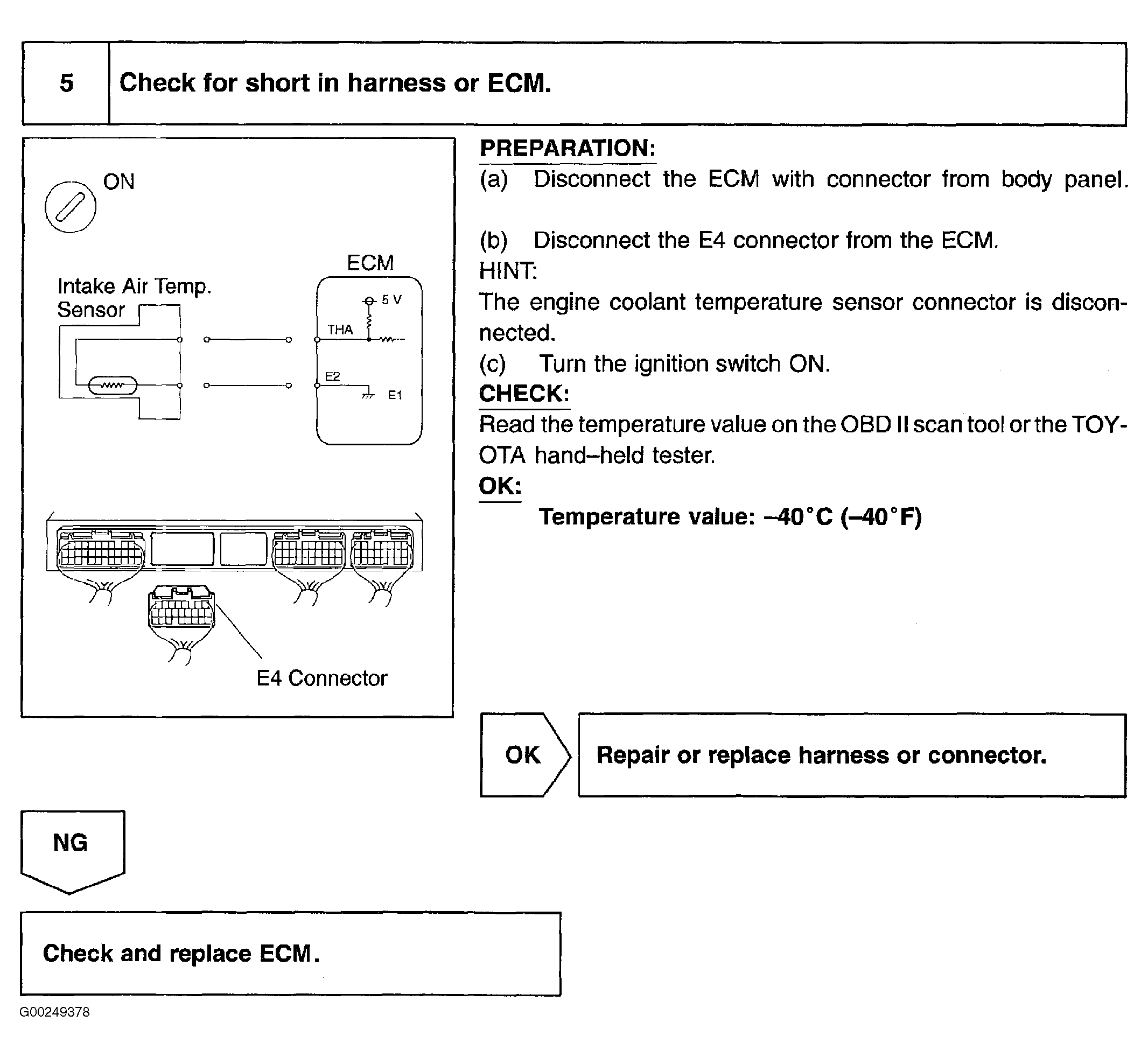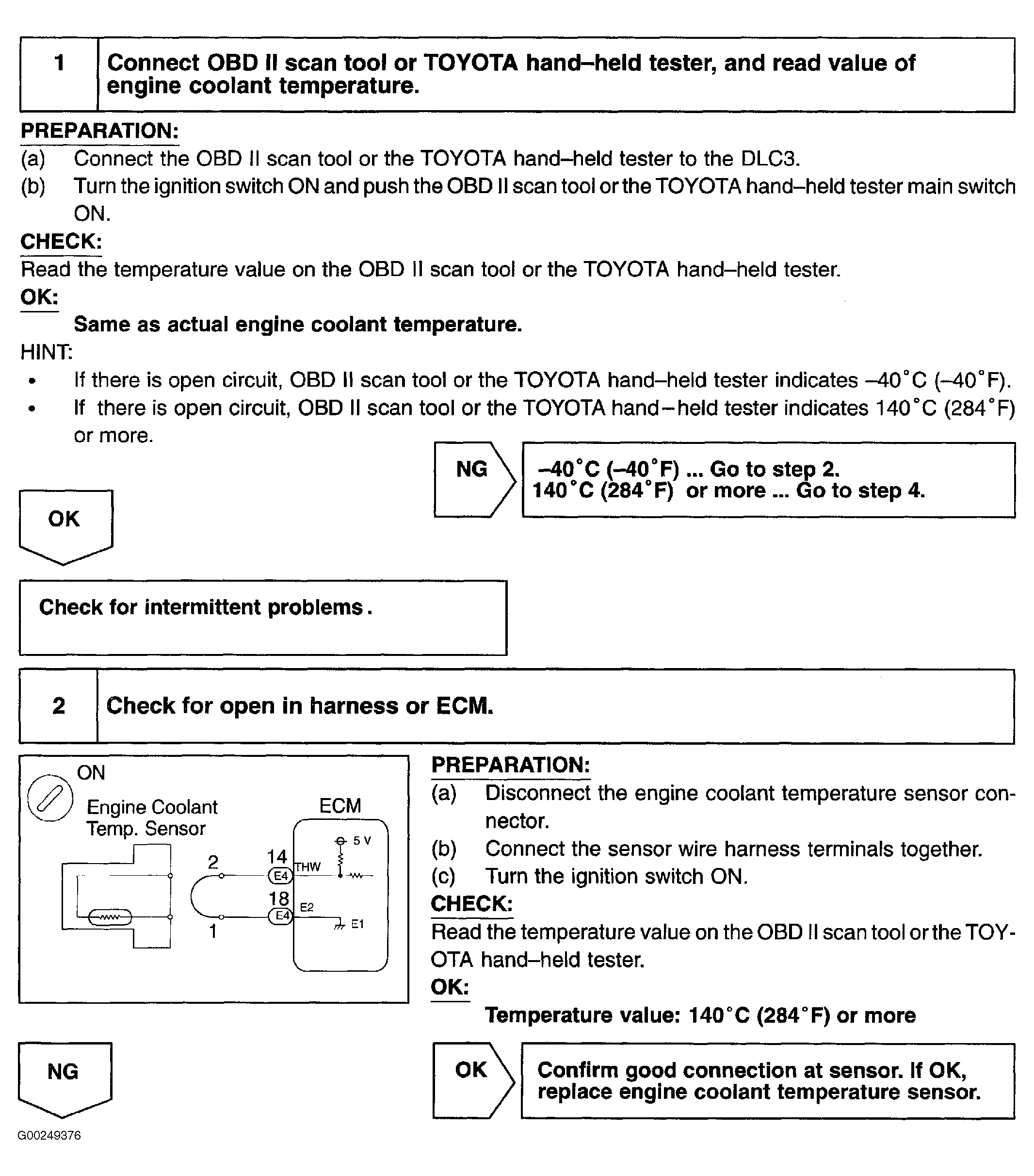 After confirming DTC P0115, use Toyota hand-held tester or scan tool to access CURRENT DATA to confirm engine coolant temperature. If ECT sensor value displayed on hand-held tester or scan tool is always -40°F (-40°C), ECT sensor circuit may be open. If ECT sensor value displayed on hand-held tester or scan tool is always 284°F (140°C), ECT sensor circuit may be shorted. Using hand-held tester or scan tool, read FREEZE FRAME data. Freeze frame data records engine conditions when malfunction is detected.