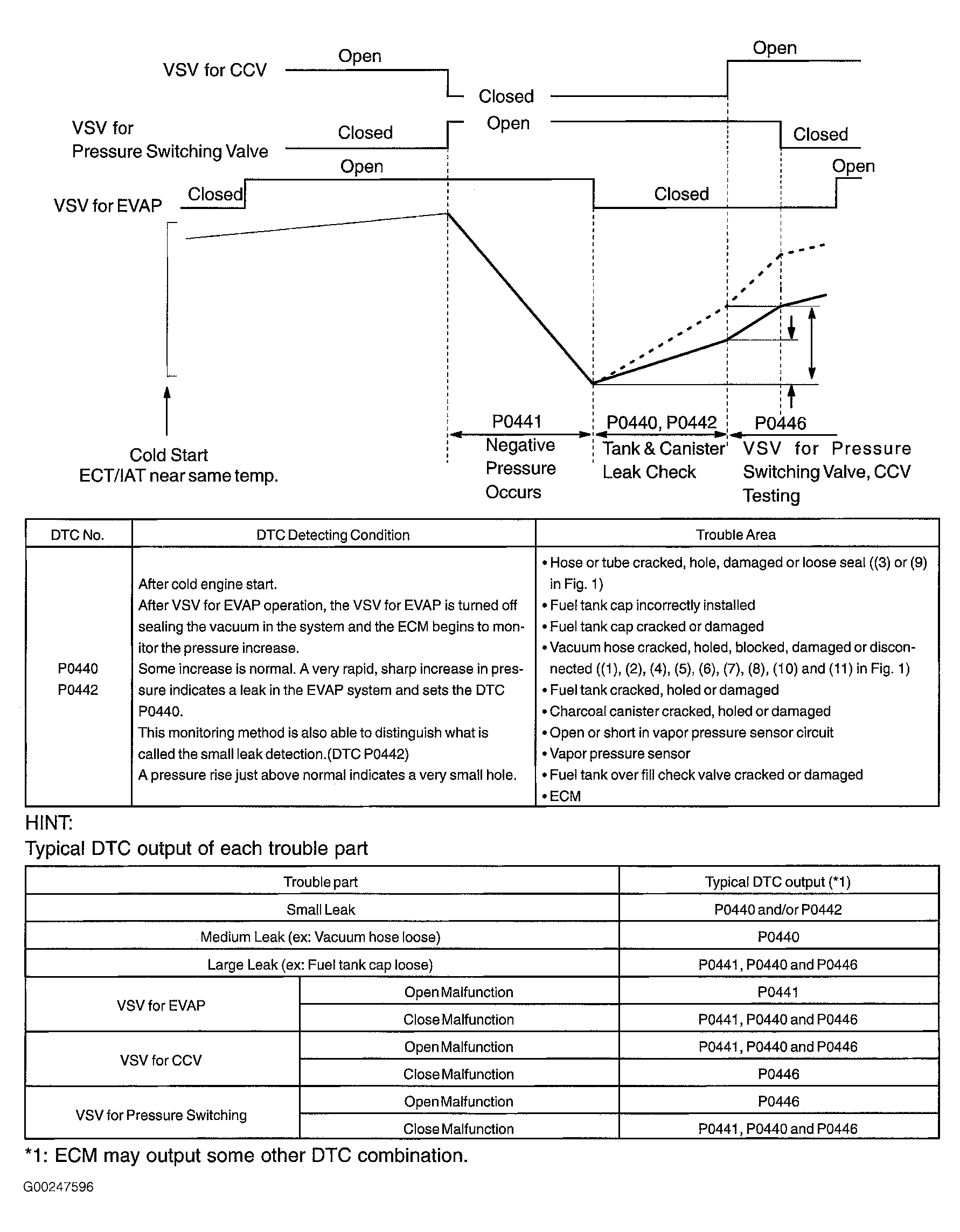 Home >> Toyota >> 2004 >> Matrix Base, FWD, Automatic >> Repair and Diagnosis >> External Pages >> Different car >> Section 132 (Engine Control System Self Diagnostics) >> Diagnostic Tests >> DTC P0440: Evaporative Emission Control System Malfunction & P0442: EVAP Emission Control System Leak Detected (Small Leak) >> Possible Causes