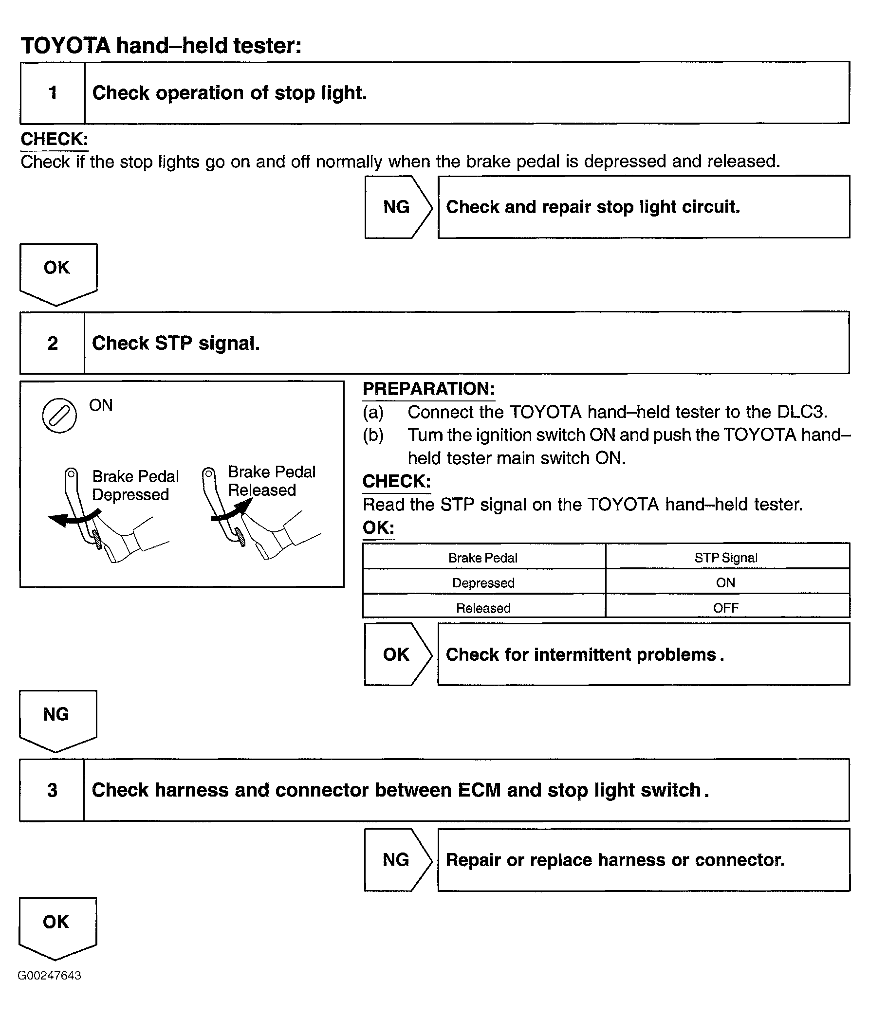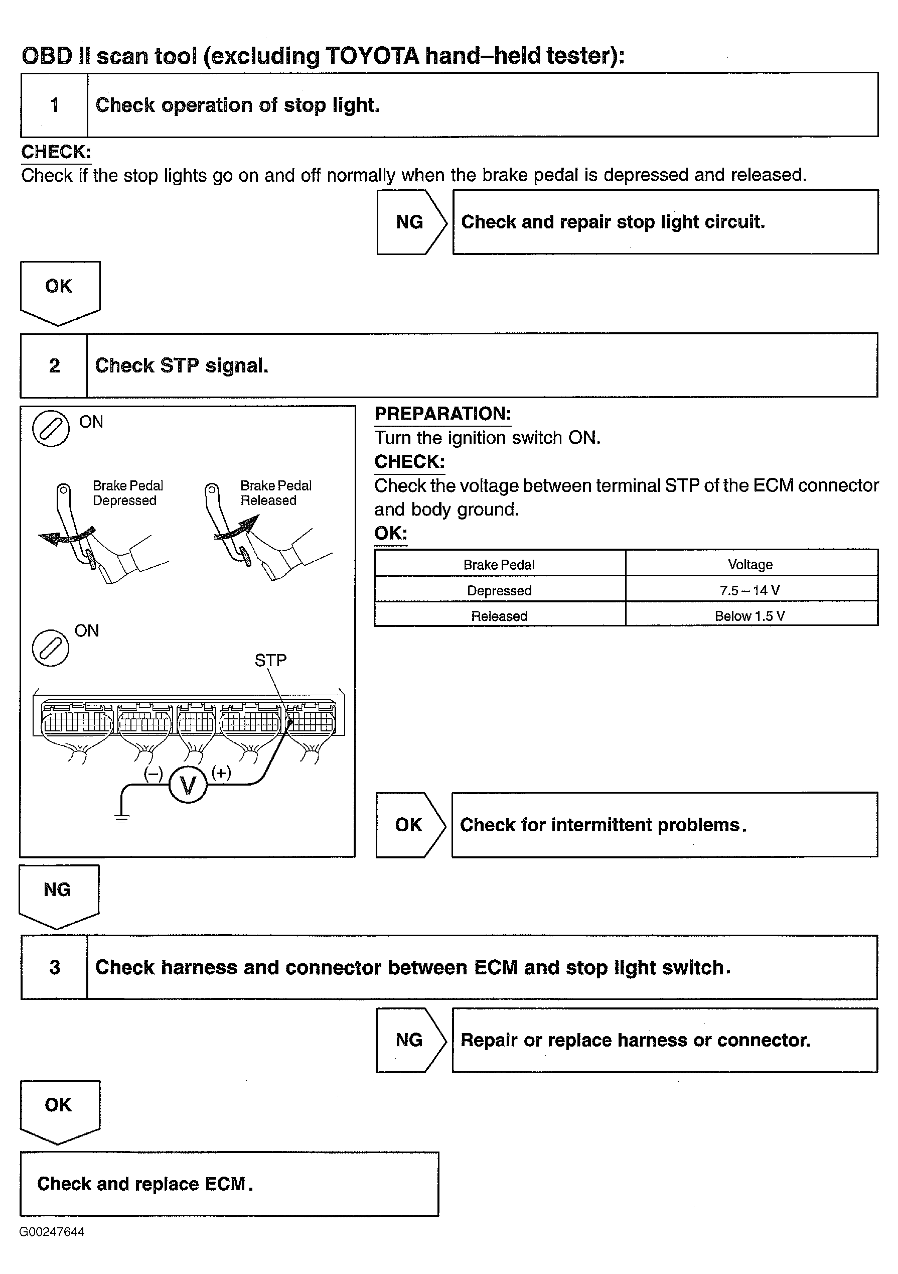 Home >> Toyota >> 2004 >> Matrix Base, FWD, Automatic >> Repair and Diagnosis >> External Pages >> Different car >> Section 132 (Engine Control System Self Diagnostics) >> Diagnostic Tests >> DTC P1520: Stoplight Switch Signal Circuit Malfunction >> Diagnosis & Repair