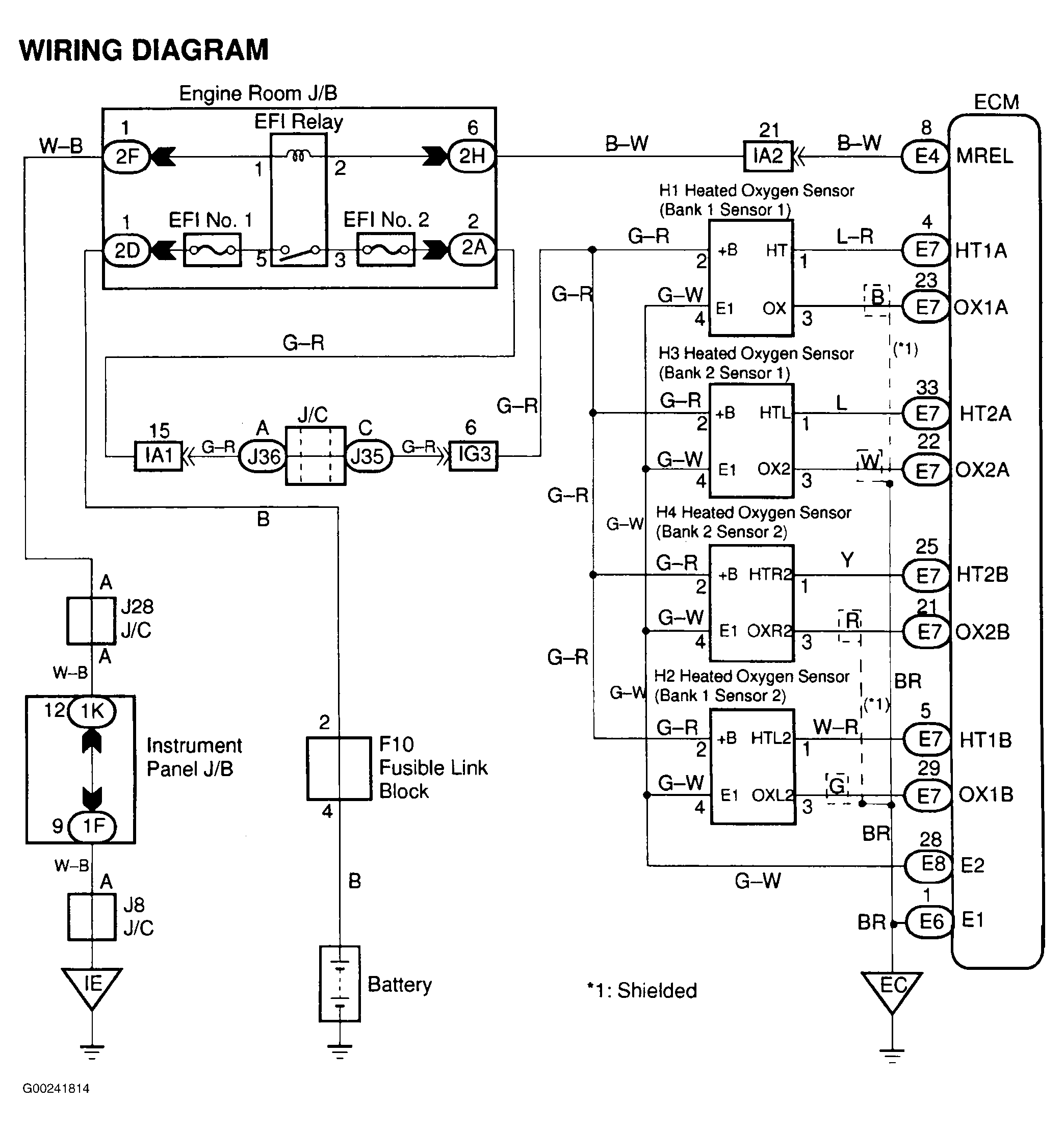 For ECM location, see Figure. For ECM connector view, see Figure. For HO2S circuit wiring diagram, see Figure. For vacuum or EVAP hose routing, see VACUUM DIAGRAMS article. For testing of systems or components, see BASIC DIAGNOSTIC PROCEDURES - V6 & V8 article or SYSTEM & COMPONENT TESTING - V6 & V8 article. For removal and installation of components, see REMOVAL & INSTALLATION - V6 & V8 article.