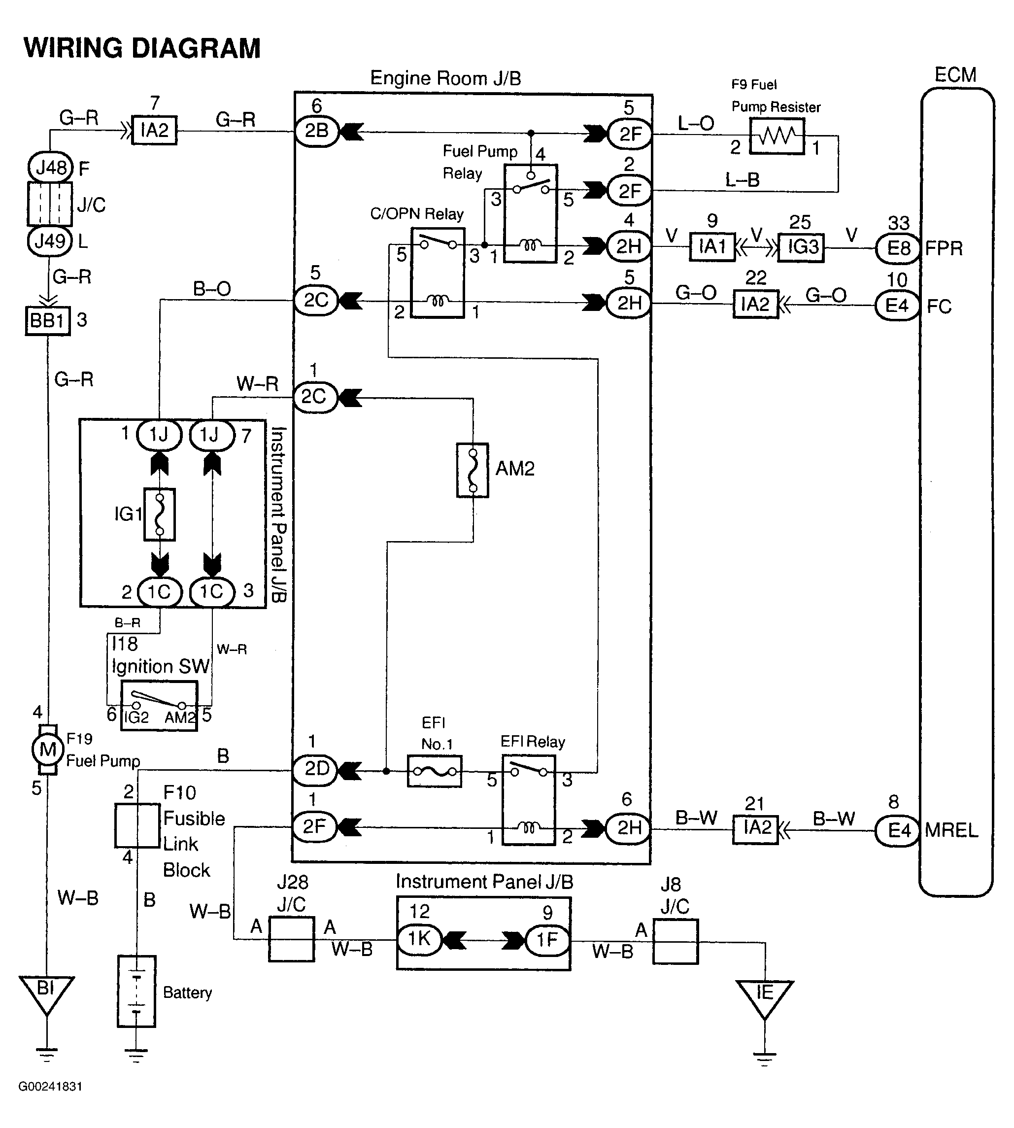 For ECM location, see Figure. For ECM connector view, see Figure. For fuel pump circuit wiring diagram, see Fig 2. For testing of systems or components, see SYSTEM & COMPONENT TESTING - V6 & V8 article. For removal and installation of components, see REMOVAL & INSTALLATION - V6 & V8 article.