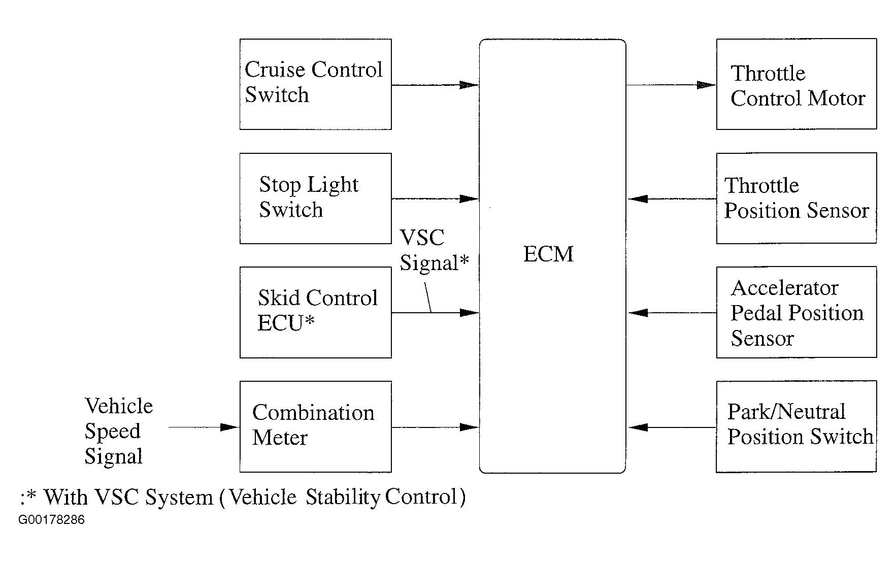The cruise control ECU is integrated with the ECM. With this system, the ECM directly controls the throttle valve to operate the vehicle at a fixed speed because it has adopted the ETCS-i (Electronic Throttle Control System-intelligent). See Fig 1.