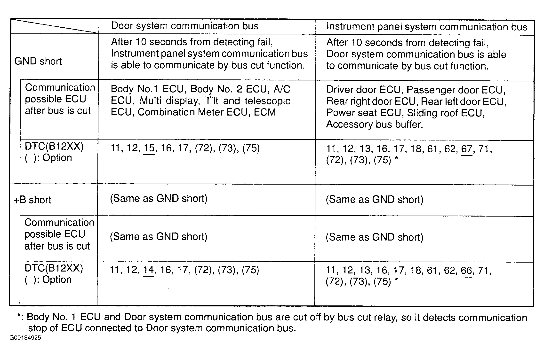 (2) When some of the DTCs 14, 15, 66, 67 is output, the DTC of other ECU communication stop is also output. In this case, please repair DTCs 14, 15, 66, 67 first. The following shows DTCs which are output when +B (battery voltage) or GND short occurs on communication bus. See Fig 1.