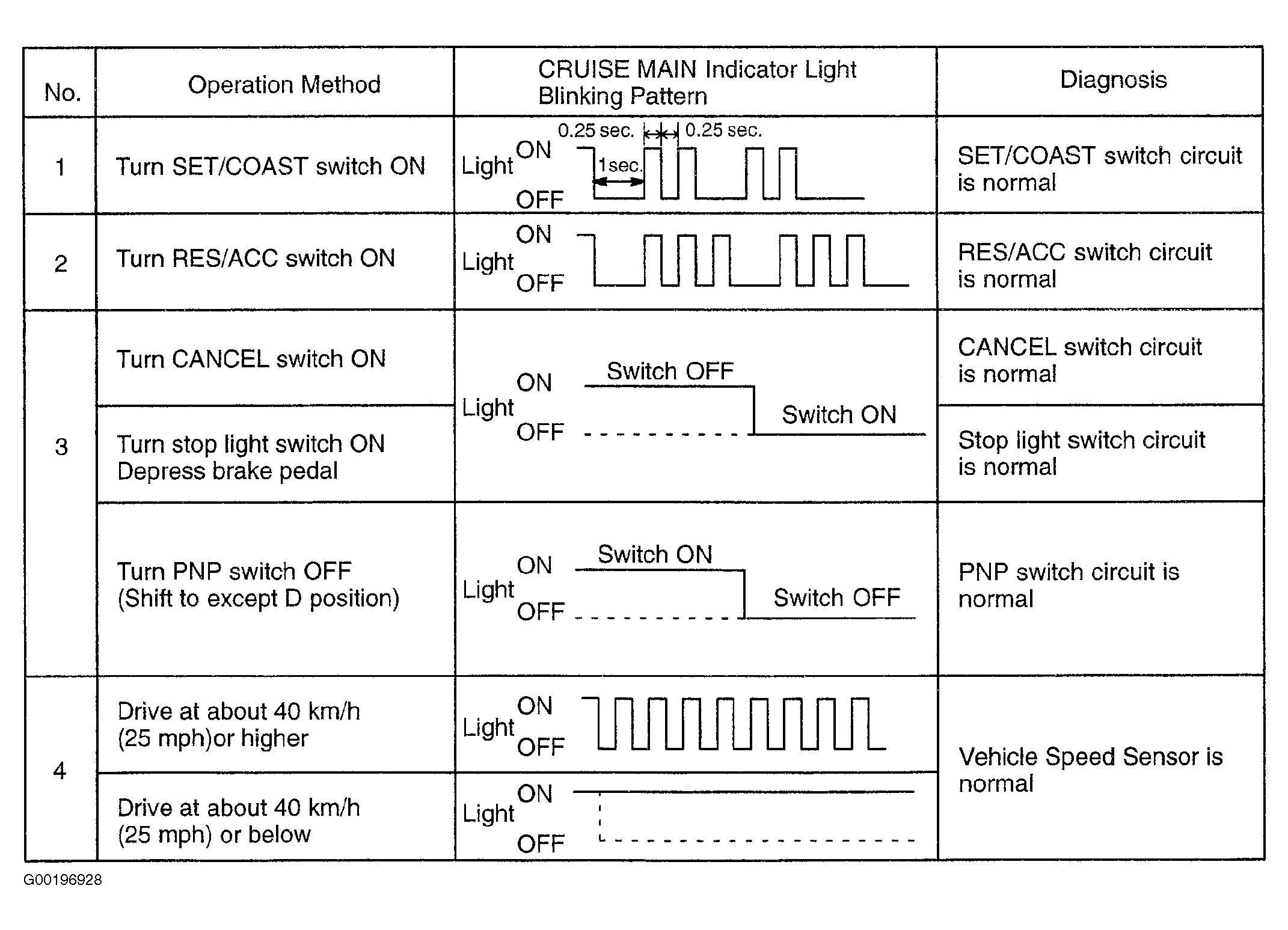 - Read the blinking pattern of the CRUISE MAIN indicator light.