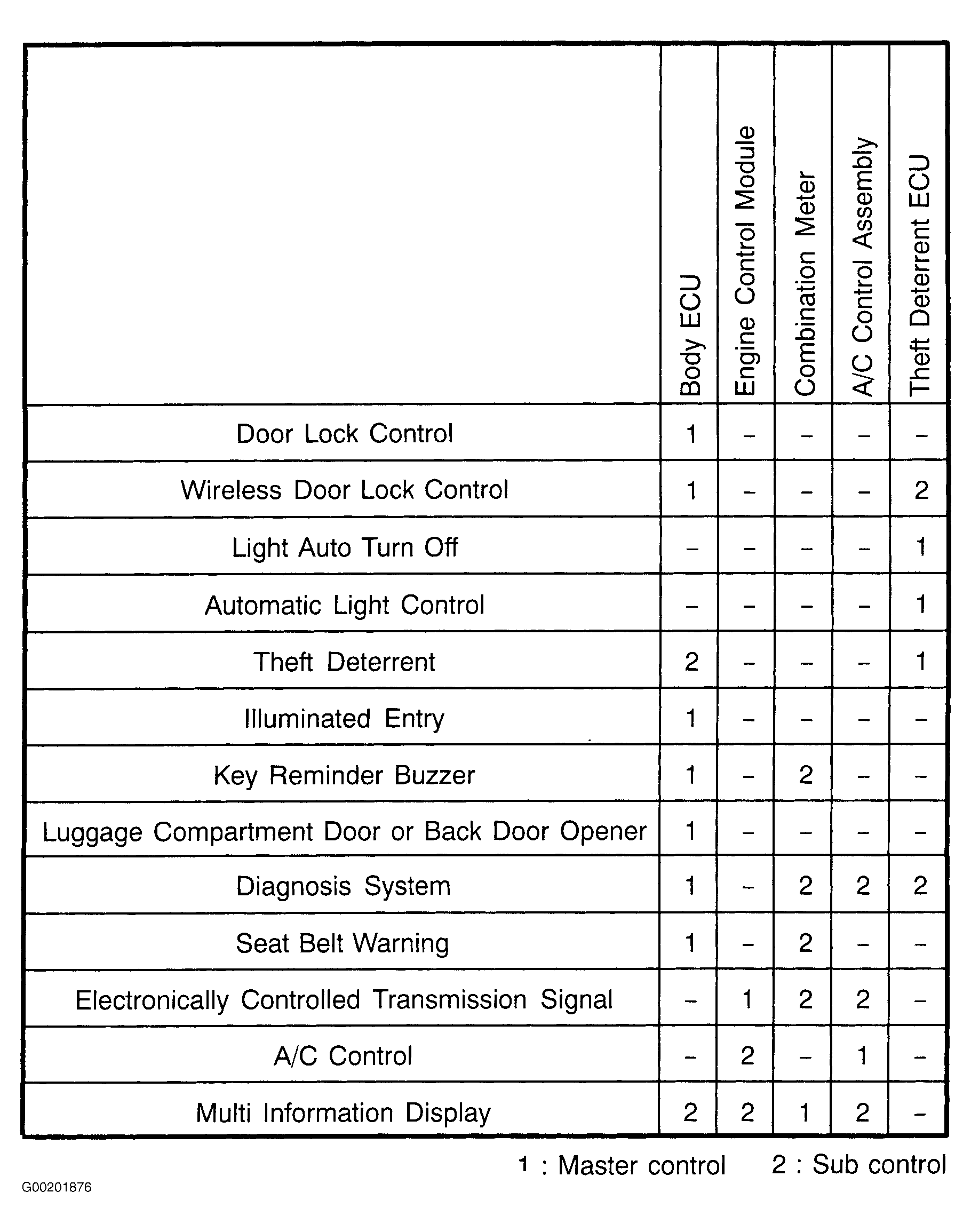 The system is comprised of the communication modes of the body ECU, engine control module, anti-theft ECU, power window master SW, combination meter and A/C control assembly. The body electrical systems are controlled by a serial communication in which each ECU is linked to another via a single communication line. This system is also equipped with a self-diagnosis function. The table below shows the systems under the control of the MPX and related ECUs (communication modes). See Fig 1.