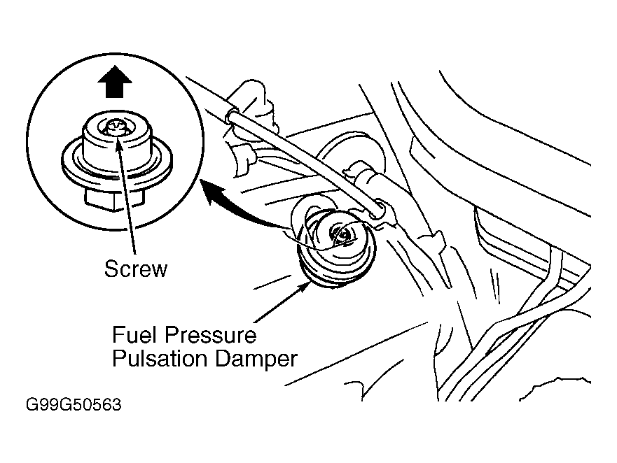 2. Turn scan tool on. Select ACTIVE TEST mode on scan tool. Using scan tool manufacturer's instructions, activate fuel pump. On GS300 and IS300, listen for fuel pump operating sound and check that screw at center of fuel pressure pulsation damper moves upward due to fuel pressure. See Fig 1. Fuel pulsation damper is located at firewall end of fuel rail. On all other models, listen for fuel pump operating sound and feel for fuel pressure in fuel inlet hose.