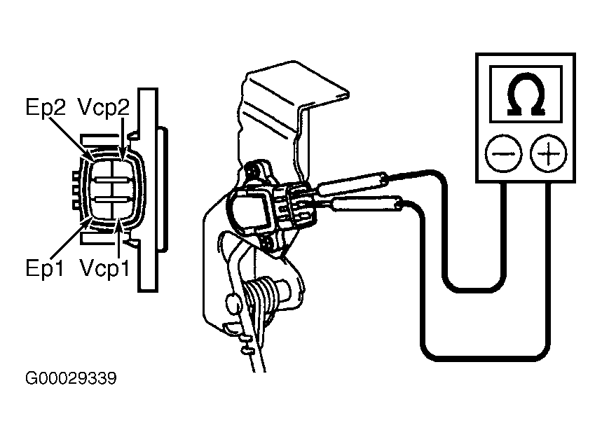 Disconnect accelerator pedal position sensor connector. Sensor is mounted above accelerator pedal. See Fig 1. Measure resistance between terminals VCP1 and EP1. Also measure resistance between VCP2 and EP2. If resistance is between 1500-6000 ohms on both circuits, accelerator pedal position sensor is okay. If resistance is not as specified, replace accelerator pedal position sensor.