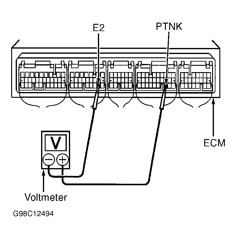 - Access Engine Control Module (ECM) behind glove box. Connect voltmeter between terminals E2 (Brown/White wire) and PTNK (Blue/Black wire) at ECM connector. See Fig 2.