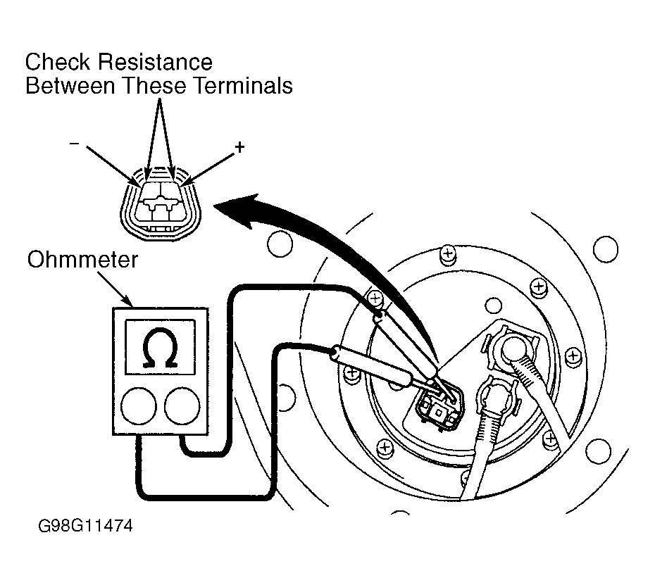 - To test fuel pump operation, apply battery voltage and ground to (+) and (-) terminals on electrical connector for fuel pump. See Fig 1. DO NOT apply battery voltage to fuel pump for more than 10 seconds. Replace fuel pump if fuel pump does not operate.