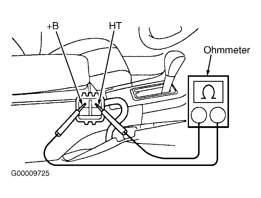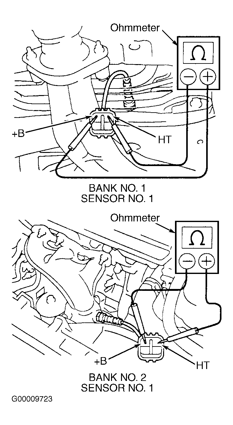 5. Disconnect electrical connector for heated oxygen sensor (bank No. 1 sensor No. 2). See Figure. Using ohmmeter, check resistance between +B and HT terminals on electrical connector for heater on heated oxygen sensor (bank No. 1 sensor No. 2). See Figure. Resistance should be 11-16 ohms at 68°F (20°C) and 23-32 ohms at 1472°F (800°C). If resistance is within specification, replace catalytic converter. If resistance is not within specification, replace heated oxygen sensor (bank No. 1 sensor No. 2). See HEATED OXYGEN SENSOR under ENGINE SENSORS & SWITCHES in REMOVAL, OVERHAUL & INSTALLATION - V6 & V8 article.