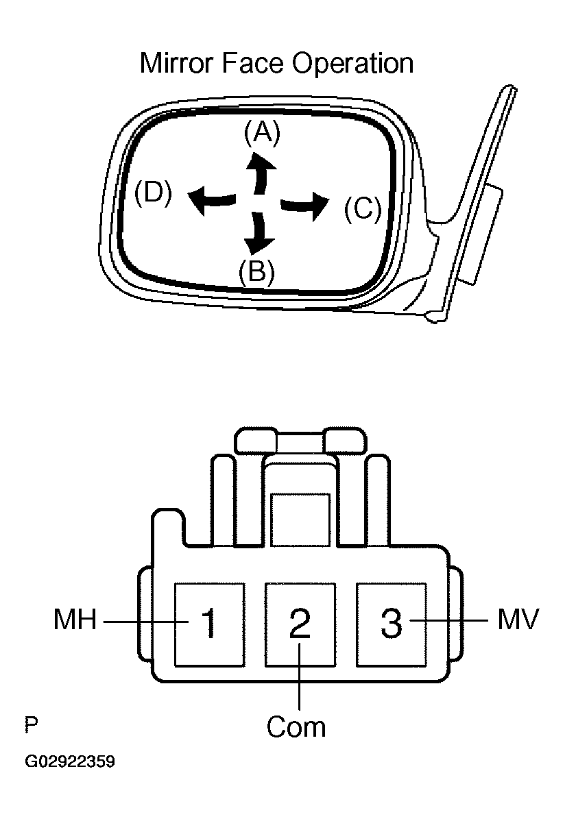 Mirror PositionBattery Connection Mirror Position Positive (+) <=> MV (3) Turn Upward (A) Negative (-) <=> Com (2) Turn Upward (A) Positive (+) <=> Com (2) Turn Downward (B) Negative (-) <=> MV (3) Turn Downward (B) Positive (+) <=> Com (2) Turn Left (C) Negative (-) <=> MH (1) Turn Left (C) Positive (+) <=> MH (1) Turn Right (D) Negative (-) <=> Com (2) Turn Right (D) If the result is not as specified, replace the mirror assembly.