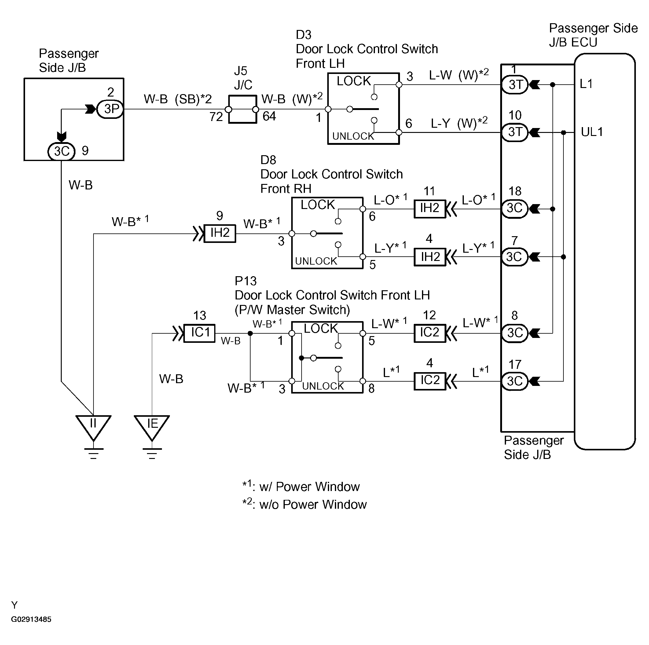 When the door lock control switch is turned to the lock position, terminal LOCK of the switch is grounded. When the switch is turned to the unlock position, terminal UNLOCK is grounded (see Figure).