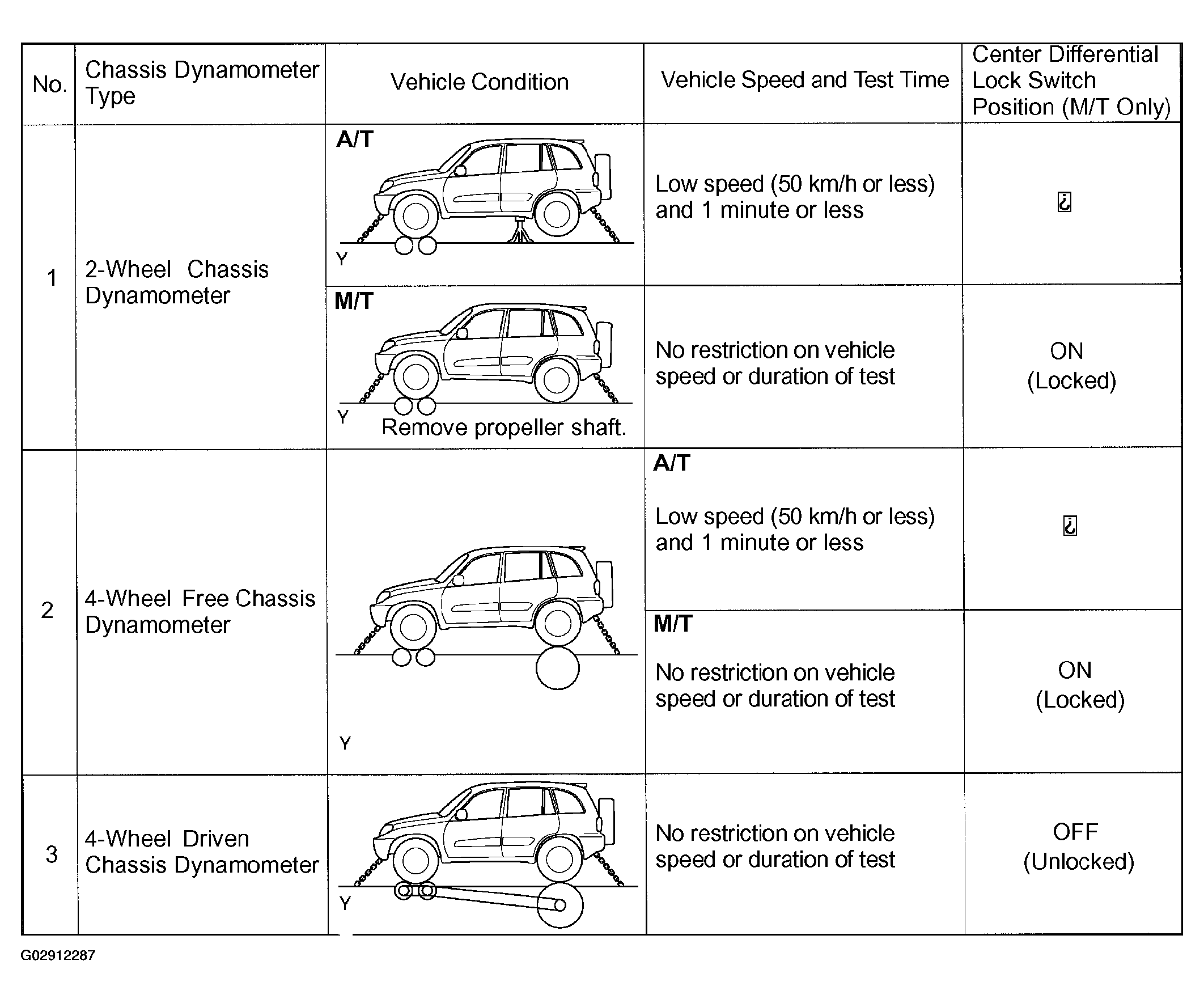 During tests with a brake tester or chassis dynamometer, such as braking force tests or speedometer tests, if only the front or rear wheels are to be rotated, it is necessary to set the position of the center differential to the FREE position or to the LOCK position depending on the type of test being performed.