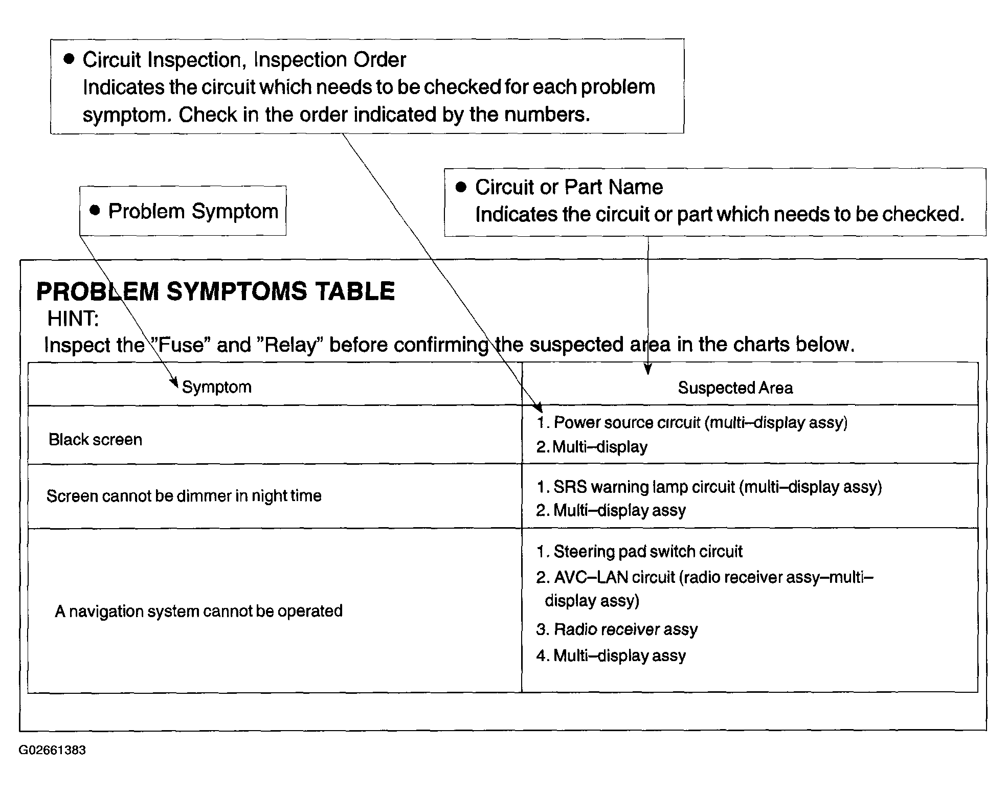 The suspected circuits or parts for each problem symptom are shown in the table below. Use this table to troubleshoot when, during a DTC check, a "Normal" code is displayed but the problem is still occurring. Numbers in the Fig 1 show the inspection order in which the circuits or parts should be checked.