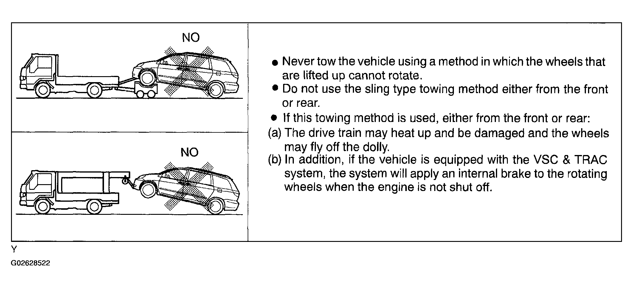 NOTE: Do not use any towing method other than those shown above.- The towing methods shown in Fig 33 are dangerous and can damage the vehicle, so do not use them.