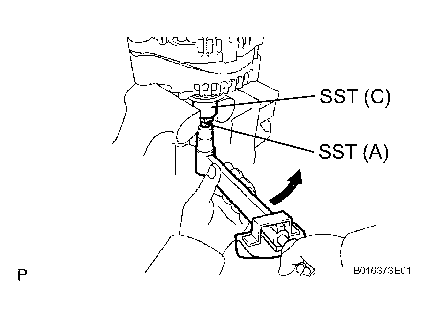 - Insert SST (B) into SST (C), and attach the pulley nut to SST (C).