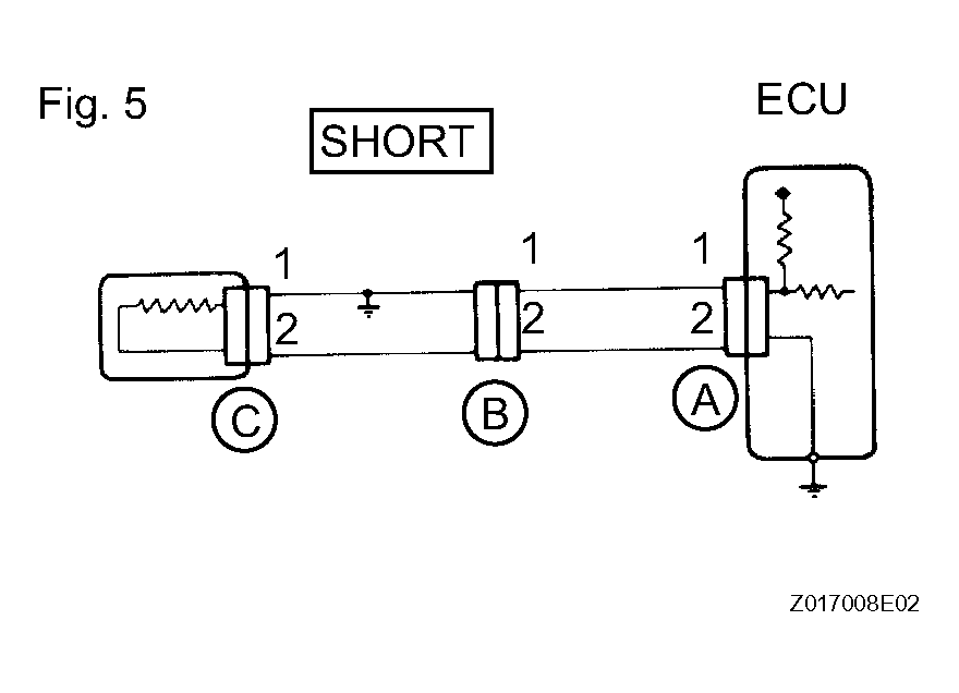 TESTER CONNECTION AND SPECIFIED CONDITION TABLETester Connection Specified Condition Connector A terminal 1 - Body ground 5 V Connector B terminal 1 - Body ground 5 V Connector C terminal 1 - Body ground Below 1 V If the results match the examples above, an open circuit exists in the wire harness between terminal 1 of connector B and terminal 1 of connector C.