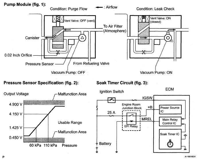 The electric vacuum pump creates negative pressure (vacuum) in the EVAP system, and the pressure is measured. Finally, the ECM monitors for leaks from the EVAP system and malfunctions in both the pump module and purge VSV, based on the EVAP pressure.