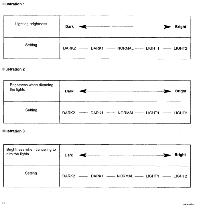 LIGHT SPECIFICATIONDISPLAY (ITEM) DEFAULT CONTENTS SETTING LIGHTING TIME (Lighting Time) 15 s To change the lighting time after closing the door. (It will quickly fade out in case of turning the ignition on (IG).) 7.5 s / 15 s / 30 s ILLUMI SYSTEM (Operation of illumination) ON Function to turn on the step light, center console light and door inside handle light when one of the following occurs; the ignition turned on (IG), door unlock or door open. ON / OFF LIGHT CONTROL (Light control) ON Function to turn on the step light and door inside handle light when the ignition switch is turned on (IG) and the shift lever is not in the P position. ON / OFF I/L ON / UNLOCK (Interior light ON w/ door key unlock) ON Function to turn on the interior light*, ignition light and step light when unlocking with the door key cylinder.