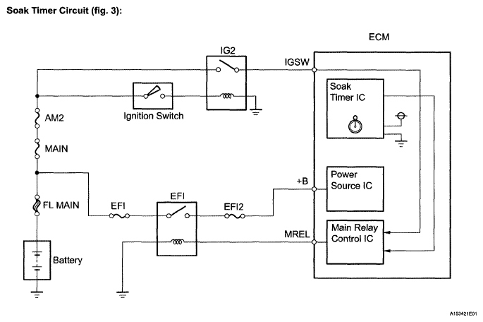 Soak timer Built into ECM. To ensure accurate EVAP monitor, measures 5 hours (+-15 min) after ignition switch turned to OFF. This allows fuel to cool down, stabilizing EVAP pressure. When approximately 5 hours elapsed, ECM activates (refer to Fig 6).