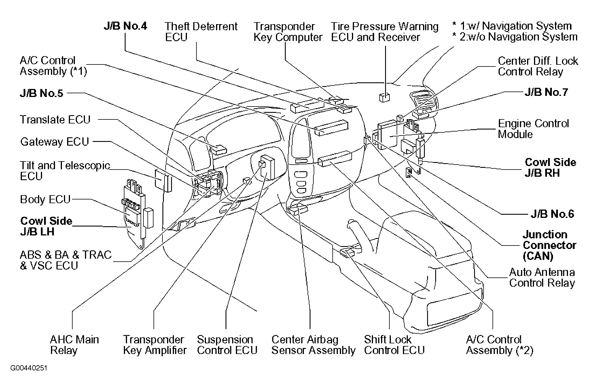 | Suspension Control ECU | Behind center of dash. See Figure. |