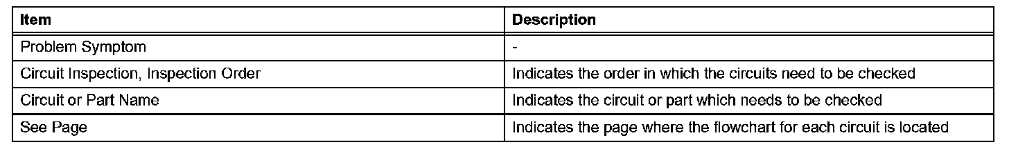 When a "Normal" code is output during a DTC check but the problem still occurs, use the Problem Symptoms Table. The suspected areas (circuits or parts) for each problem symptoms are in the table. The suspected areas are listed in order of probability. A description of each of the chart's columns is shown in the table.