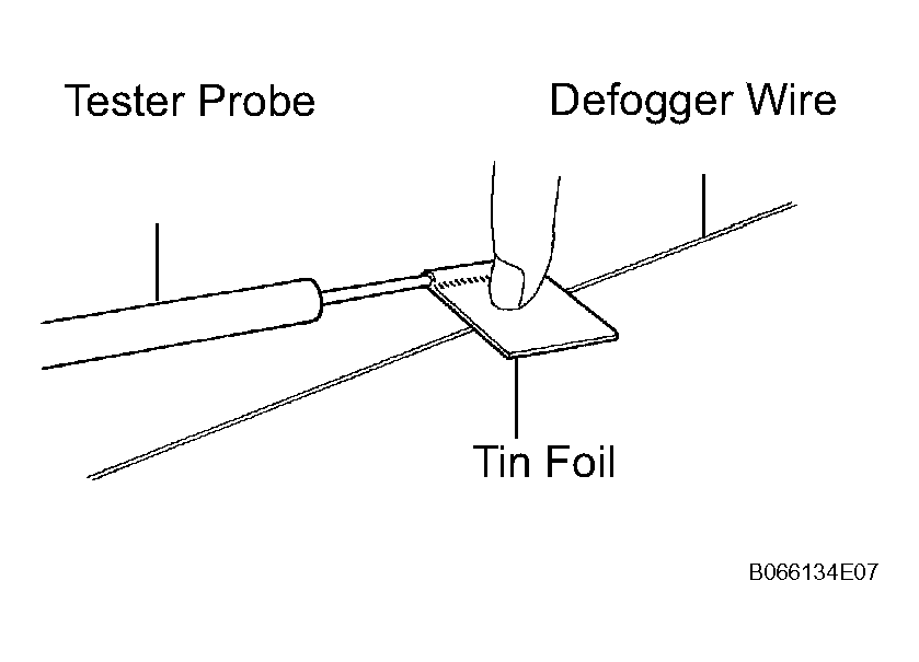 If the defogger wire is not broken, the voltmeter indicates 0 V at the positive (+) end of the defogger wire and gradually increases to approximately 12 V as the meter probe moves to the other end.
