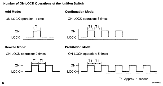 After completing the above operation, proceed to the next step in accordance with the prompts on the Techstream screen.OFF for 1 second and then ON 4. Remove the key and then push the Next button on the Techstream. ON 5. Insert the master key to be registered and then push the Next button on the Techstream. OFF for 1 second and then ON 6. Remove the key. Blinking 7. End (Procedure "E") HINT: