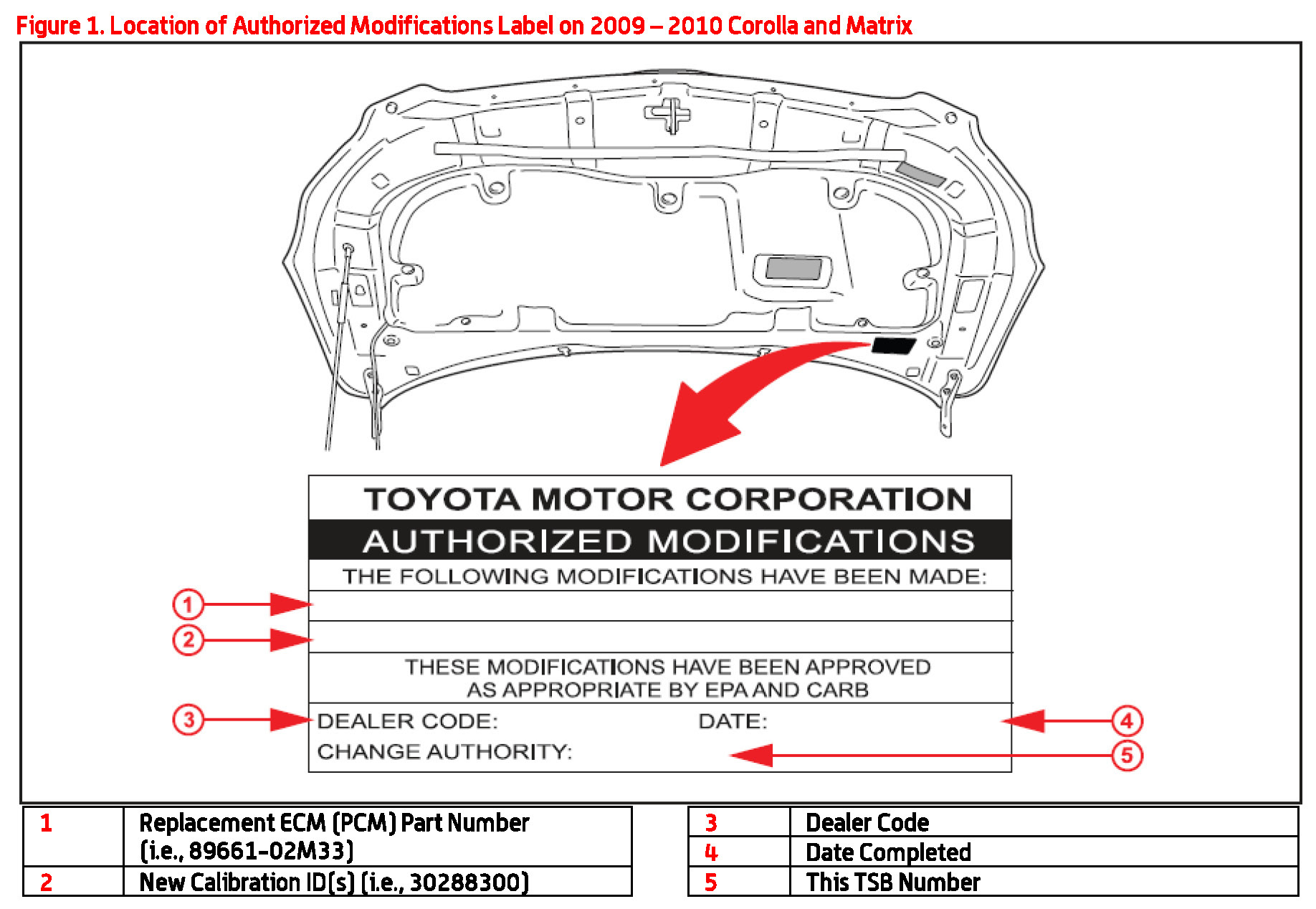 4. Check for the Authorized Modifications Label affixed to the vehicle in the location shown in Figure 1. Confirm if the ECM (PCM) calibration has been updated. If the calibration ID listed is NOT the latest ECM (PCM) calibration - go to step 5.