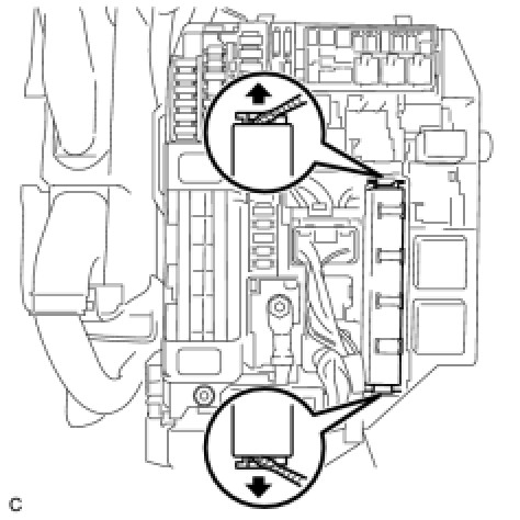 (b) Using a screwdriver with its tip wrapped in protective tape, disengage the 2 claws and then pull the integration relay out of the No. 1 relay block.