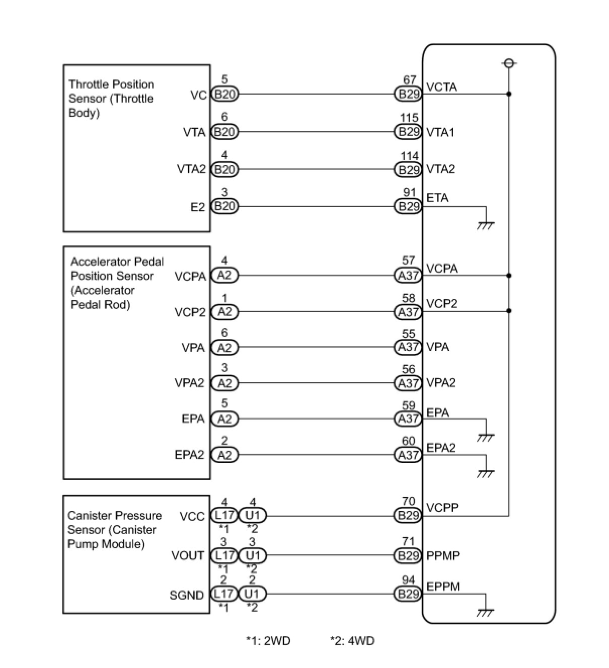 The ECM constantly generates 5 V power from the battery voltage supplied to the +B (BATT) terminal to operate the microprocessor. The ECM also provides this power to the sensors through the VC output circuit.