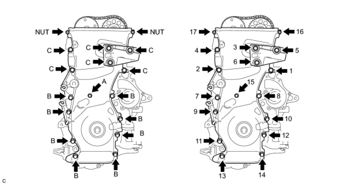 Fully tighten the timing chain cover with the 15 bolts and 2 nuts as shown in the illustration.