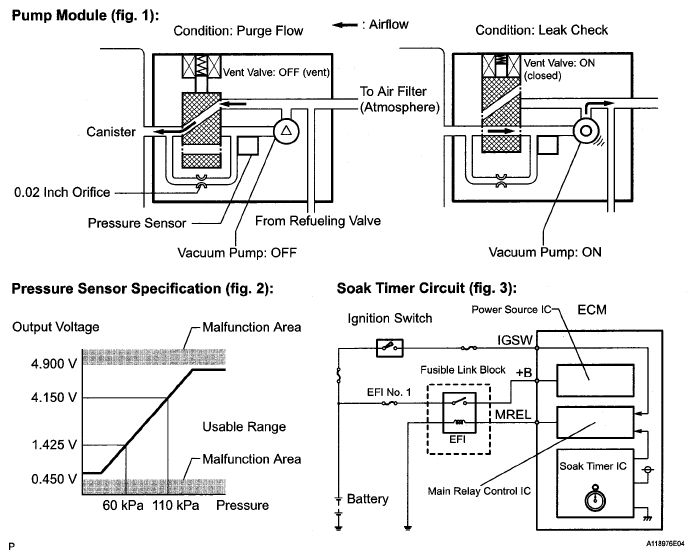 The electric vacuum pump creates negative pressure (vacuum) in the EVAP system, and the pressure is measured. Finally, the ECM monitors for leaks from the EVAP system and malfunctions in both the pump module and purge VSV, based on the EVAP pressure.