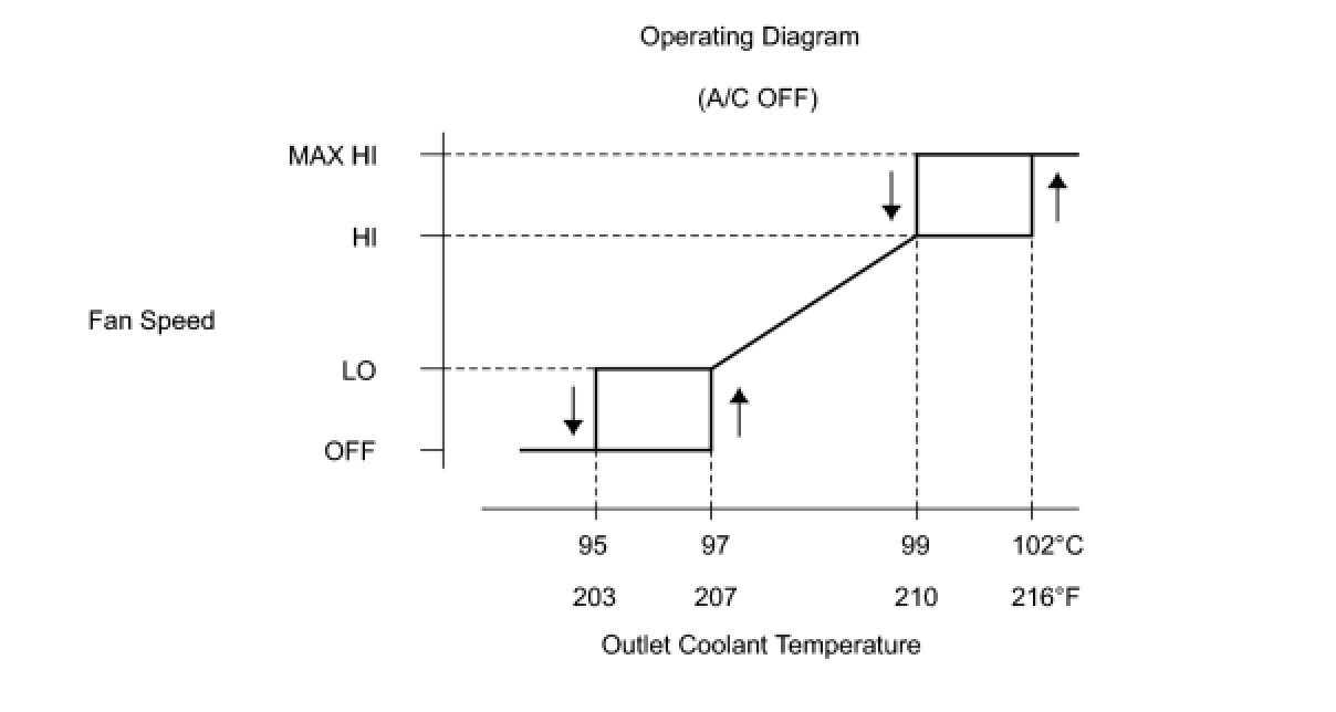 * The coolant temperature at which the fan starts operating is approximately 97°C (207°F).