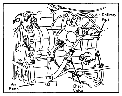 This system uses a belt-driven air pump to supply air under pressure to the exhaust manifold where it mixes with exhaust gases and causes further oxidation (burning) of the exhaust gases. The injected air from the pump passes through a one-way check valve to a single entry point in the exhaust manifold. See Fig 1. The one-way check valve prevents the reverse flow of exhaust gases into the air pump when exhaust gas pressure exceeds air pump pressure. A relief valve, located in the air pump, is used to dump excess pump pressure at high engine speeds to prevent pump damage.