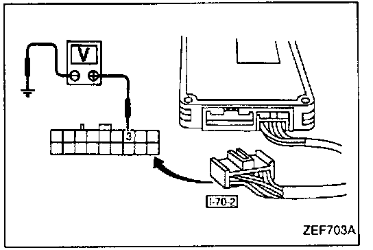 2. Measure voltage between terminal (3) (+ end) of instrument harness connector [I-70-2] and body ground (- end).
