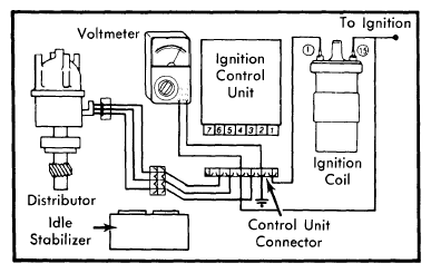 - Turn ignition switch "OFF" and reconnect ignition control unit plug. Disconnect distributor connector plug. Connect the positive lead of voltmeter to terminal 15 of coil and the negative lead to terminal 1 of coil. See Fig 2.