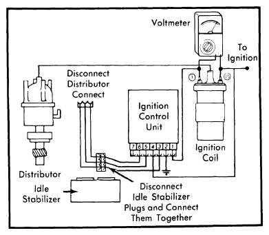 - Disconnect both plugs at idle stabilizer control unit and connect plugs together. Remove connector from distributor. Connect positive lead of voltmeter to terminal 15 of ignition coil. Connect negative lead to terminal 1 of coil. See Fig 1. Turn ignition switch "ON".