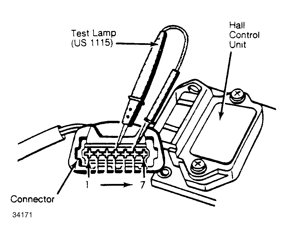 - Connect Test Lamp (US 1115 ) to terminal 4 and 6 of control unit connector. See Figure. Crank engine and check signal from sending unit. If test lamp LED flickers, sending unit is okay. If not, turn ignition off and reconnect Hall control unit.