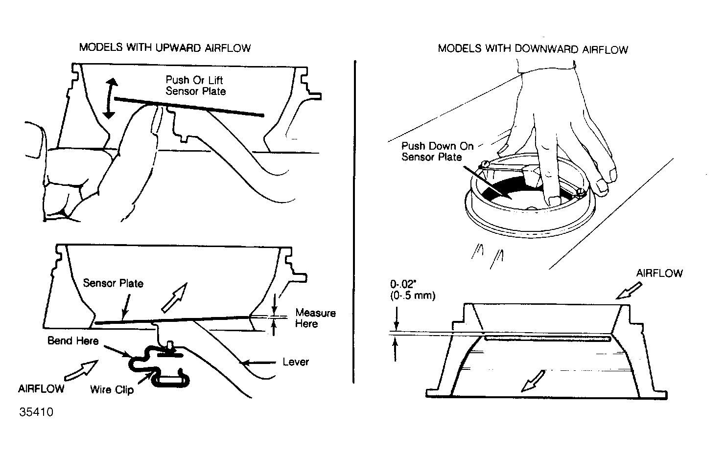- Check airflow sensor plate height adjustment. Plate should be even with bottom rim or 0.02" (0.5 mm) lower. If not, bend spring clip or reposition stop pin (tap lightly with punch) to set plate height. See Fig 2 .