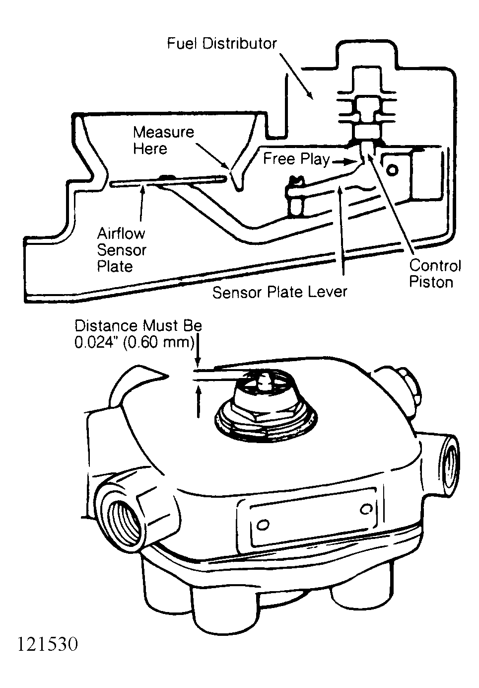 - If free play clearance is incorrect, remove fuel distributor. Check basic adjustment of sensor plate lever. Install fuel distributor and repeat free play clearance check. If still incorrect, adjust sensor plate clearance with control piston stop screw.