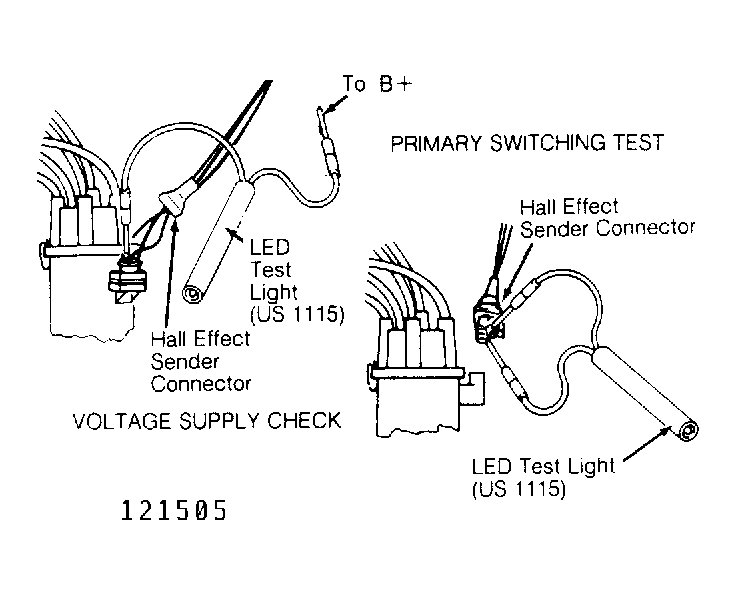 - If voltage was okay in step 1), pull back hall sender boot to expose contact terminals. Apply LED Test Light (US 1115) probe to center contact and battery positive terminal. See Figure . Observe test light while cranking engine. If test light blinks, hall sender is okay. If not, replace hall sender.